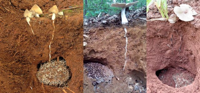 如果白蟻巢體上培養(yǎng)的是雞樅菌的菌絲體,當(dāng)春天來(lái)臨、雷雨過(guò)后,蟻巢上方的土壤含水量增大,形成適當(dāng)?shù)臏夭?、濕差、氣壓差,巢體上就會(huì)形成原基,原基長(zhǎng)高形成假根,假根穿過(guò)巢體上方的空間,進(jìn)入巢體上方的土壤,土壤中含水量適宜,假根很快長(zhǎng)出土面形成菌柄,菌柄頂端形成菌蓋。雨后空氣濕度大,適合菌柄和菌蓋的生長(zhǎng),在土面上就會(huì)突然長(zhǎng)出大量雞樅菌的子實(shí)體。每年的5月至10月,只要我們不破壞蟻巢,不擾動(dòng)、驚嚇白蟻,一個(gè)蟻巢可以連續(xù)出菇4至5批次。營(yíng)養(yǎng)豐富的雞樅菌子實(shí)體為地面上的昆蟲(chóng)以及人類(lèi)提供了美味的食物。在一個(gè)很小的干重不到100克的蟻巢體上,就可采集到500克以上的鮮菇,這個(gè)出菇行為會(huì)大量消耗白蟻所需要的營(yíng)養(yǎng)物質(zhì)。